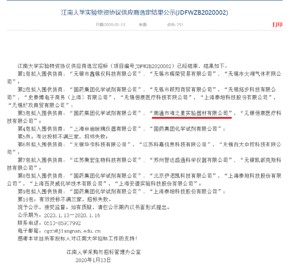 江南大學實驗物資協議供應商選定結果公示(JDFWZB2020002)